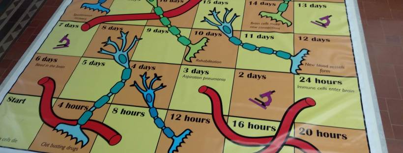 There is also the opportunity to win funding to develop resources for public engagement. Catriona and her group, who focus on stroke research, were awarded an ISSF Wellcome Trust public engagement grant to develop new activities to explain their research. “I had so much fun being involved in developing a giant snakes and ladders game to explain the pathology of stroke and therapies our lab are researching to promote recovery. We also made a giant Kerplunk style game to explain how blood clots can cause ischaemic stroke and how thrombolysis breaks these down and restores blood flow to the brain.”