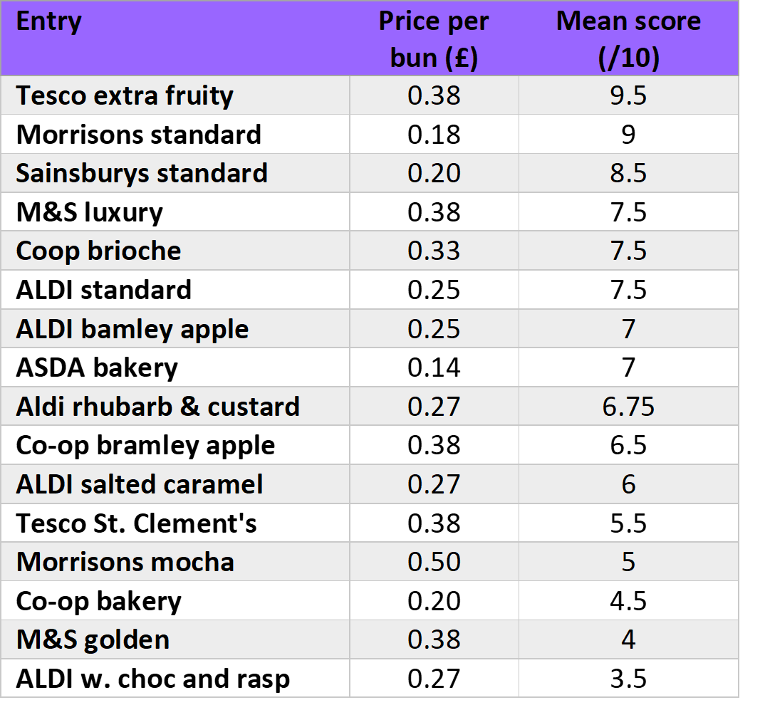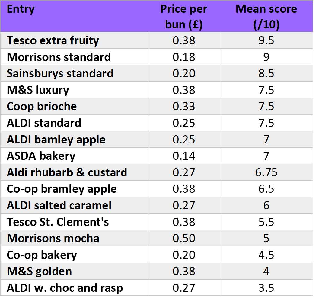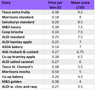 Table 1. A summary of all reviewed hot cross buns, in descending order of average score. ASDA bakery, Morrisons mocha, and ALDI brambley apple were scored by guest reviewers.