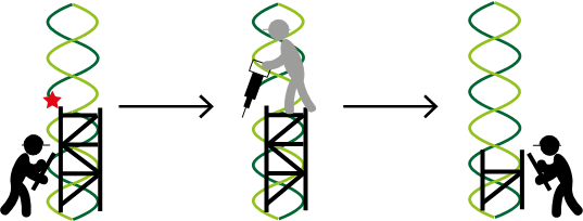 When DNA damage is detected, cell division decelerates and two sets of enzymes, represented as construction workers, work together to repair the damage. One set, poly(ADP-ribose) polymerases (PARPs), are the builders who make poly(ADP-ribose) (PAR) scaffold near the breakage site. This process is called poly(ADP-ribosyl)ation. The other set, poly(ADP-ribose) glycohydrolases (PARGs), are the destructors who dismantle PAR. Key cellular proteins, the machines, access and mend the breakage. These components prevent further damage and keep the cells alive. Under exceptional circumstances, the breakage sites that remain uncorrected cause ‘mistakes’ or mutations in the genetic code. Normal cells have an extremely slow mutation rate.