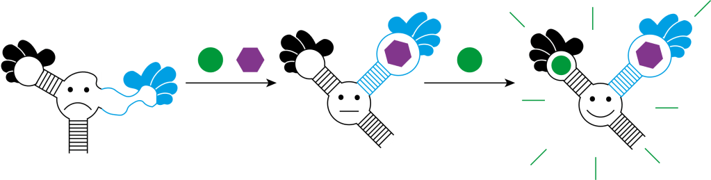 The biosensor is composed of an RNA aptamer called Spinach (black) and the recognition module aptamer (blue). The recognition module aptamer undergoes a conformational change upon binding to the target (purple hexagon), with high specificity. This allows Spinach to also undergo a conformational change, so that it binds to a fluorophore called 3,5-difluoro-4-hydroxybenzylidene imidazolinone (green circle), which fluoresces when bound. As a result, the whole system ‘lights up’ to indicate the presence of the target. As you might have guessed, the RNA aptamer is called Spinach, because it shines green light when bound to 3,5-difluoro-4-hydroxybenzylidene imidazolinone.