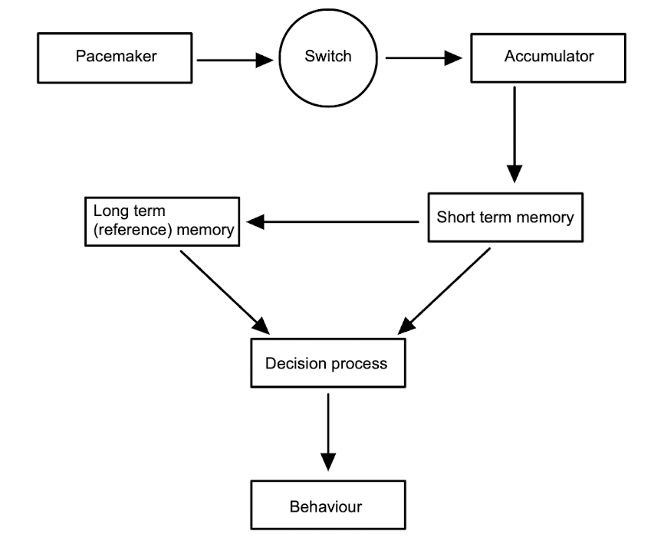 The idea that time perception in humans is controlled by an internal clock can be traced back to the early 1900s. The theory behind the internal clock, namely scalar expectance (or scalar timing) theory (SET) was first studied in animals. SET is then applied to humans to investigate the properties of the internal clock. The diagram below shows a version of SET focussing on information processing.