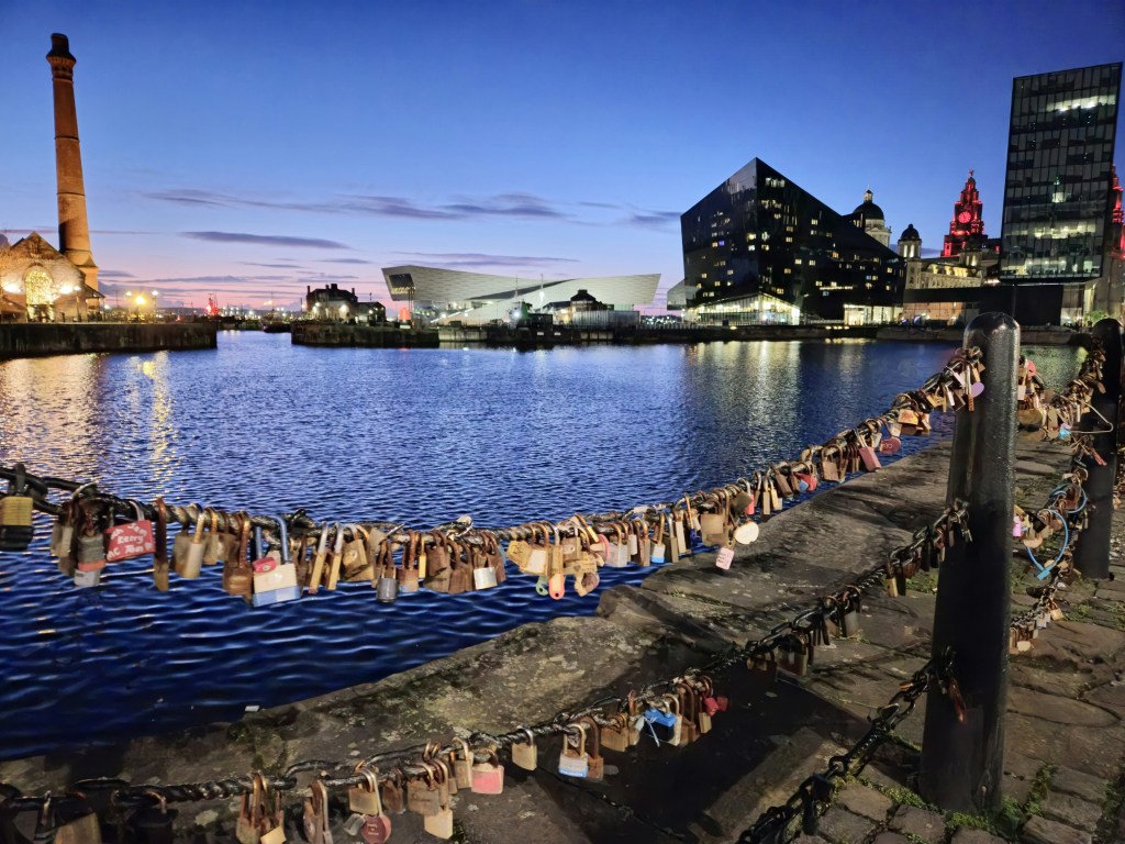 Take a break and soak in the sights. View of the Liverpool Docks at night.