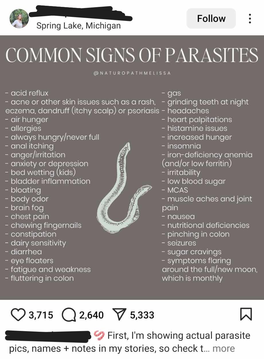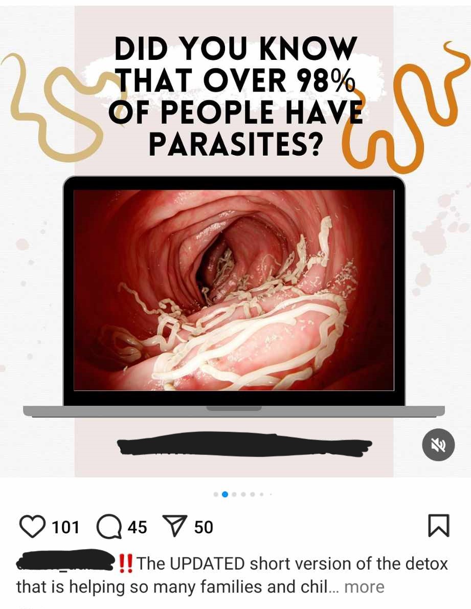 If fabricated numbers aren’t enough, they’ll gladly offer a list of symptoms that supposedly indicate you need a parasite cleanse. These lists can include just about anything. Sprinkling in some Google-able parasite symptoms, they will also list any generic symptom you might ever experience. Skin conditions, stress, anxiety and trouble sleeping are other common things listed, symptoms that can apply to almost anyone. Children are not excluded. Mothers to young children are a common demographic for those selling and buying, capitalising on parental worries. Some pages will even push their cleanses and detoxes as an option to mothers concerned about their child’s behaviour and development, especially around autism. Misdiagnosing neurodivergence as parasites and suggesting an all-natural all-curing laxative will make them “better” is a really problematic concept.