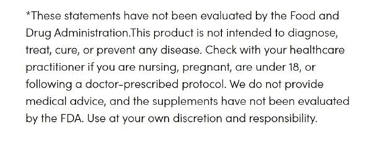 Even though they’re exploiting loopholes to sell advertised medical products without any pesky regulations, they still need to exercise some caution. Medicines are of course very heavily regulated, but when you label something as a “dietary supplement”, you have more wiggle room. For this reason, there is a large disconnect between the wording they use on social media versus the small print under the product.