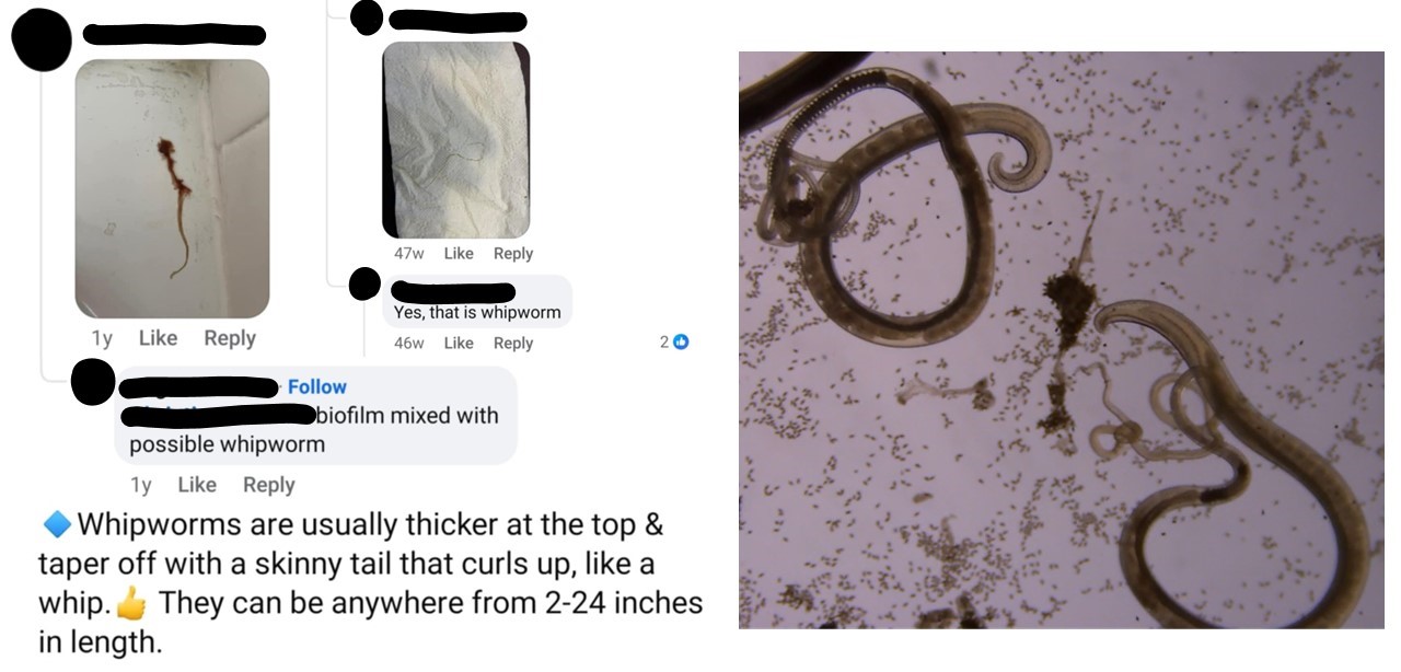 Worried consumers flock to closed Facebook groups to post pictures, asking for help with identifying whatever has fallen out of them. I scoured through some examples in a large Facebook group of 15k members. The group admin and self-proclaimed parasite expert responded to all these photo enquiries with a confirmation: Yes, that’s a parasite! It’s always a parasite, no matter how unlike a worm I thought it looked, which is lucky because they sell a handy PDF on parasites for $175. Others will confirm that all images indicate a parasite infection and refer people straight to their product.