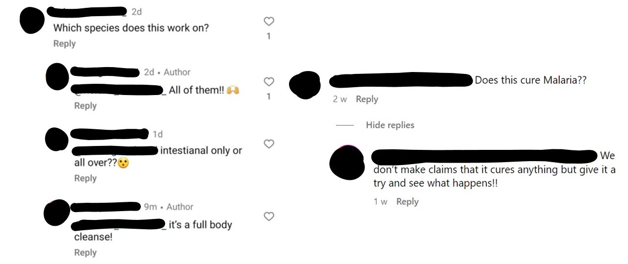 I got a proud response to an enquiry I made, that a kit can treat ALL species of parasites, even non-intestinal species, yet the website says it’s not intended to treat any disease! It is easy to slip under the radar if your product fits under the FDA (USA) or FSA (UK), who don’t have the resources to investigate every pop-up dietary supplement until they get reports of harm caused. They will discourage people from seeking medical advice on social media, but again the small print will contradict this to protect themselves.